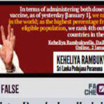 කොරෝනා එන්නත්කරණය අනුව ශ්රී ලංකාව ලෝකයේ රටවල් අතරින් ලංකාව 04 වන ස්ථානයේ පසුවන බවට සෞඛ්ය අමාත්ය කෙහෙළිය රඹුක්වැල්ල මහතා කරන ලද ප්රකාශය අසත්ය බව ෆැකට්චෙක් ආයතනය උපුටමින් ඩේලි මිරර් වාර්තා කරයි. ලෝකයේ රටවල් 194 ක් අතරින් එන්නත්කරණය අනුව මු...