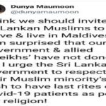 ලංකාවේ සියළු ඉස්ලාම්භක්තිකයෝ මාල දිවයිනේ පදිංචියට එන්න-මාලදිවයිනේ හිටපු විදේශ ඇමති දුන්යා මවුමූන් මාලදිවයිනේ හිටපු විදේශ ඇමති දුන්යා මවුමූන් මහත්මිය තම සමාජ ජාල ගිණුමේ සටහනක් තබමින් පවසා සිටින්නේ ශ්රී ලංකාවේ සිටින මුස්ලිම් ජාතිකයන්ට මාලදිවයිනේ පදිංචියට එන්නැයි ආරාධනා කළ යුතු බව පවසා සිටී...
