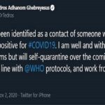 ලෝක සෞඛ්යය සංවිධානයේ ප්රධානී ටෙඩ්රොස් අදනොම් ගෙබ්රියුස්(Tedros Adhanom Ghebreyesus) මහතා ස්වයං නිරෝධායනයට ලක්ව සිටින බව ලෝක සෞඛ්යය සංවිධානයේ ආරංචි මාර්ග පවසයි. මේ අතර ට්වීටර් පනිවිඩයක් නිකුත් කරමින් ඒ මහතා ප්රකාශ කර සිටින්නේ " මම කොවිඩ් 19 වෛරසය ආසාදනය ව...