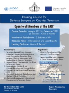 ත්රස්තවාදය වැලැක්වීමේ පනත යටතේ අධිකරණයට ඉදිරිපත් කරණ විත්තිකරුවන් වෙනුවෙන් පෙනී සිටින නීතිඥවරුන්ට තම කාර්ය සාර්ථකව ඉටුකිරීම සඳහා අවශ්යය පුහුණුව ලබා දීමට එක්සත් ජාතීන්ගේ අන්තරාකාරී ඖෂධ සහ අපරාධ පිළිබඳ කාර්යාලය (UNODC) කටයුතු කරමින් සිටින බව වාර්තාවේ.