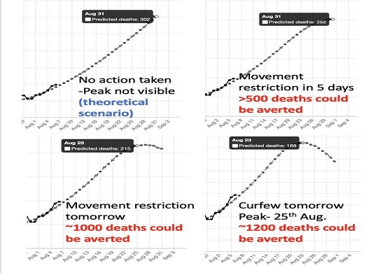 තම ට්විටර් ගිණුමේ සටහනක් තබමින් මාහචාර්ය සුනෙත් අංගම්පොඩි මහතා පවසා සිටින්නේ වහාම ශ්රී ලංකාවට ඇඳිරි නීතිය පැනවුවහොත් ඉදිරි දින 20 තුළ සිදුවන අතිරේක කොරෝනා මරණ 1200ක් වළක්වා ගත හැකි වනු ඇති බවයි.