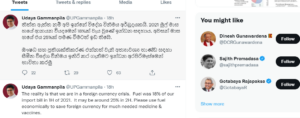 බලශක්ති අමාත්යය උදය ගම්මන්පිල මහතා සිය ” ට්විටර්”ගිනුමේ සටහනක් තබමින් මහජනයාගෙන් ඉල්ලා සිටින්නේ විදේශ විනිමය ඉතිර කර ගැනීම සඳහා ඉන්ධන අරපිරිමැස්මෙන් භාවිතා කරන ලෙසයි.