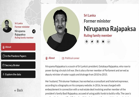 ලෝකයේ ධනය සඟවන ලද පුද්ගලයන් සම්බන්ධයෙන් හෙලිදරවු කිරීමක් සිදු කර ඇති සිදු කර ඇති විමර්ශනාත්මක මාධ්යවේදීන්ගේ ජාත්යන්තර ජාලය (ICIJ) විසින් මෙරට හිටපු ඇමතිනි නිරූපමා රාජපක්ෂ සම්බන්ධයෙන් හෙලිදරවු කිරීමක් කර තිබිණි.