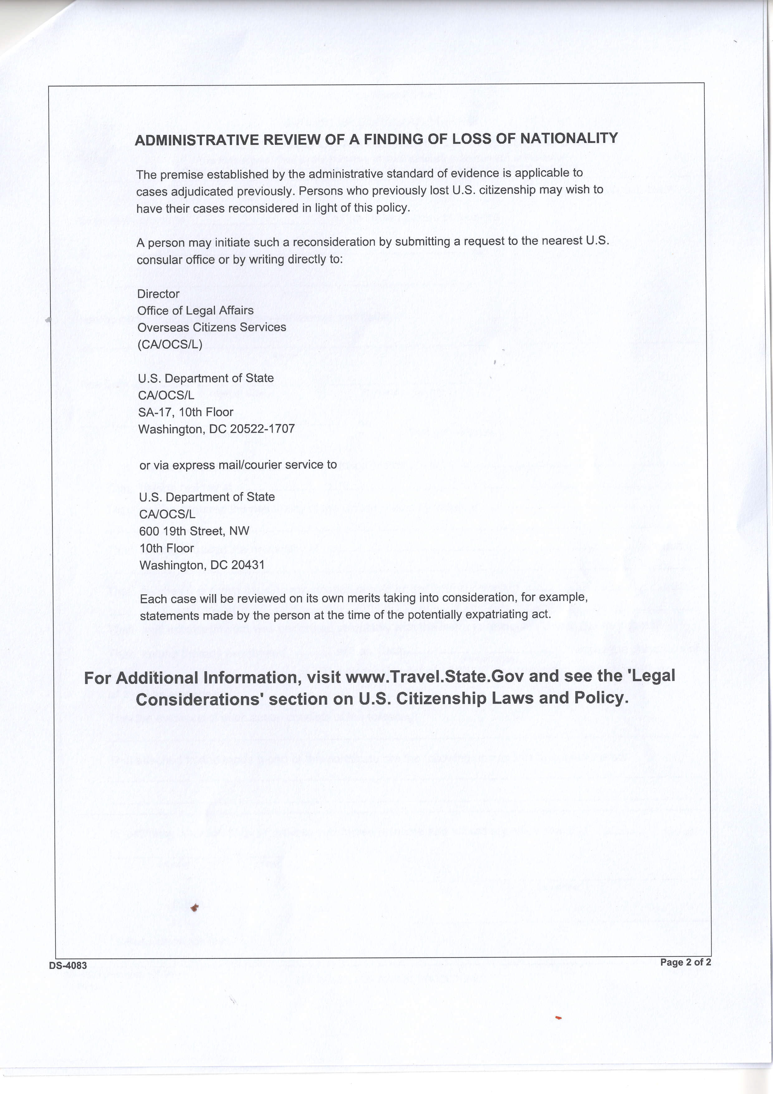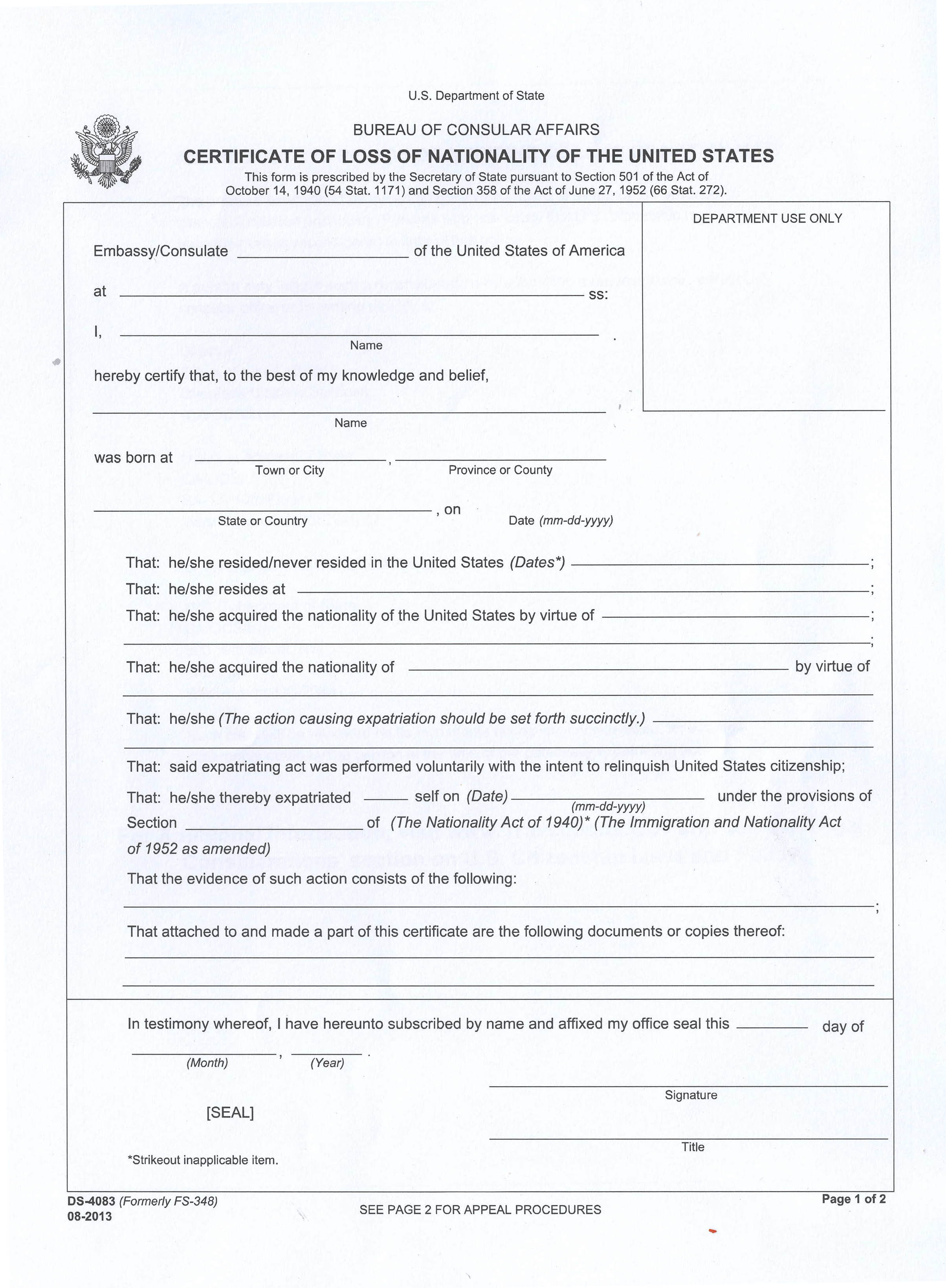 තානාපති කාර්යාලයේ දී පුරවැසිකම අත්හැරීමේ ලේඛණයට තානාපති කාර්යාලයේ නිලධාරියා සහ සාක්ෂිකරුවන් ඉදිරිපිට අත්සන් තැබුවාම ඒ මොහොතේ සිට පුරවැසිකම අවසන් වෙනවා. ඒ බව සහතික කරලා ඩීඑස් 4083 කියන මෙන්න මේ ලේඛණය ලබා දෙනවා. ඒකට තමයි පුරවැසිකම අත්හැරීමේ සහතිකය කියන්නේ. රියදුරු බලපත්රය ලැබෙන තුරු දෙන තාවකාලික රියදුරු බලපත්රය වගේ, රක්ෂණ සහතිකය ලැබෙන තුරු දෙන තාවකාලික රක්ෂණ ආවරණය වගේ මේ සහතිකය තාවකාලිකයි. ඇමෙරිකාවේ රාජ්ය දෙපාර්තමේන්තුව විසින් පුරවැසිකම අත්හැරීමේ ස්ථිර සහතිකයක් නිකුත් කරන තෙක් මෙම ලේඛණය වලංගුයි.