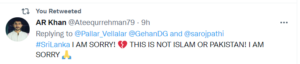 AR Khan නම් තවත් පාකිස්තාන වැසියෙකුත් දැඩි කනගාටුව පළකරමින් කියා තිබුණේ ඉස්ලාම් ධර්මය හෝ පාකිස්තානය යනු මෙවැන්නක් නොවන බව.