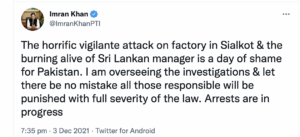 ශ්රී ලාංකිකයා පුලුස්සා දැමූ සිකුරාදා සිය ජාතිය අවඥාවට ලක් කළ දිනයක් ලෙසින් හඳුන්වන අගමැති ඉම්රාන් ඛාන්, වැරදිකරුවන් සියලු දෙනාට නීතිය ප්රකාර උපරිම දඬුවම් දෙන බවට සපත කොට තිබිණ.