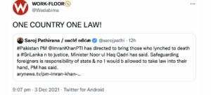 මේ අතර අගමැති ඉම්රාන් ඛාන්ගේ ප්රකාශයට ප්රතිචාර දක්වමින් එක් ට්විටර් පණිවුඩයක දැක්වුණේ ශ්රී ලංකාවේ නම් අපරාධකරුවන්ට මේ අන්දමින් නීතිය ක්රියාත්මක නොවනු ඇති බව ඇඟවෙන සටහනකි.
