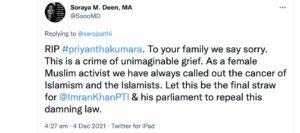ඉස්ලාමාබාද් නුවර පිහිටි Global Youth Association සංවිධානයේ සභාපති කාශිෆ් සහීර් (Kashif Zaheer) ට්විටර් ඔස්සේ සිංහල භාෂාවෙන් ප්රකාශයක් කරමින් “පකිස්තානු ශ්රී ලාංකික ජනතාවගෙන් සහ ඝාතනයට ලක් වූ ප්රියන්ත දියෝදනගේ පවුලේ අයගෙන් මම සමාව අයදිනවා …” යනුවෙන් සඳහන් කර තිබුණේ දෙඅත් ඔසවා ආචාර කරන සංඥාවක් ද සමගිනි.