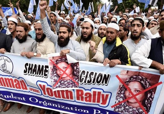 එහෙත් එම තීරණය විරෝධතාවලට තුඩු දුන්නා. රටේ ප්රධාන නගරවල ඉස්ලාමීය අන්තවාදීන් ප්රමුඛකරගත් පිරිස් ඊට මූලික වී සිටියා. 2018 වසරේ නොවැම්බර් මස පකිස්ථාන රජය විරෝධතාවලට නායකත්වය දුන් Tehreek-e-Labbaik දේශපාලන පක්ෂය සමඟ ගිවිසුමකට පවා අත්සන් තැබුවා. ඒ බිබීට රටින් පිටවීමට අවස්ථාව නොදෙන බවට එකඟ වෙමින්. ඒ අනුව ඇයට රටින් පිටවීම තහනම් කෙරුනා.