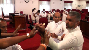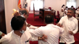 ධම්මික පෙරේරා සමඟ මන්ත්රීවරු කිහිප දෙනෙකු වචන හුවමාරු කරගන්ත්දී පොදුජන පෙරමුණේ මන්ත්රී ආනන්ද සනත් කුමාර මහතා ඊට මැදිහත් වුණා. එම අවස්ථාවේ ධම්මික පෙරේරා මහතා විසින් ආනන්ද සනත් කුමාර මහතාට ප්රහාරයක් එල්ල කිරීම නිසා සභාවේ දැඩි නොසන්සුන්කමක් හා උණුසුම් තත්ත්වයක් ඇති වුණා.