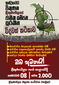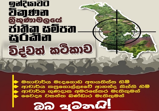 ත්රිකුණාමලය තෙල් ටැංකි ඉන්දියාවට විකිණිමට එරෙහිව “ඉන්දියාවට විකුණන ත්රීකුණාමලයේ ජාතික සම්පත සුරකින විද්වත් කථිකාව” නමින් සම්මන්ත්රණයක් පෙබරවාරි 08 වන දින(හෙට ) සවස 02:00ට ත්රිකුණාමලය නගර සභා ශාලාවේදී පැවැත්වෙන බව ත්රිකුණාමලය බහුජන සංවිධාන එකමුතුව පවසයි.