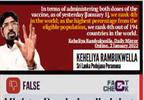 කොරෝනා එන්නත්කරණය අනුව ශ්රී ලංකාව ලෝකයේ රටවල් අතරින් ලංකාව 04 වන ස්ථානයේ පසුවන බවට සෞඛ්ය අමාත්ය කෙහෙළිය රඹුක්වැල්ල මහතා කරන ලද ප්රකාශය අසත්ය බව ෆැකට්චෙක් ආයතනය උපුටමින් ඩේලි මිරර් වාර්තා කරයි.