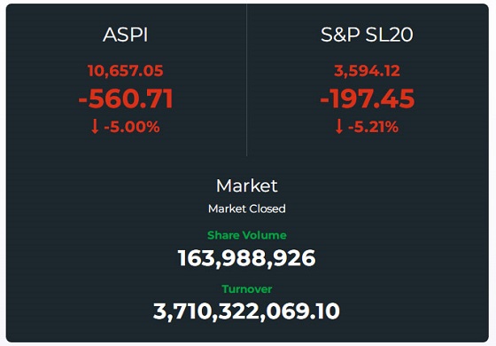 කොළඹ කොටස් වෙළෙඳපොළ සියලු කොටස් මිල දර්ශකය ඊයේ (24) දිනයේ දී ඒකක 560.71 ක පහළ යාමක් වාර්තා කළ බව පැවසේ. මෙය මෙතෙක් ඉතිහාසයේ තනි දිනක් තුළ සියලු කොටස් මිල දර්ශකයේ වාර්තා වූ දෙවැනි විශාලතම කඩා වැටීම විශ්ලේෂකයෝ පවසති. ඒ අනුව මෙම කඩා වැටීම දෙවැනි වන්නේ 2021 පෙබරවාරි 02 වැනි දින ඒකක 561.75කින් සියලු කොටස් මිල දර්ශකයේ වාර්තා වූ කඩා වැටීමට පමණි.