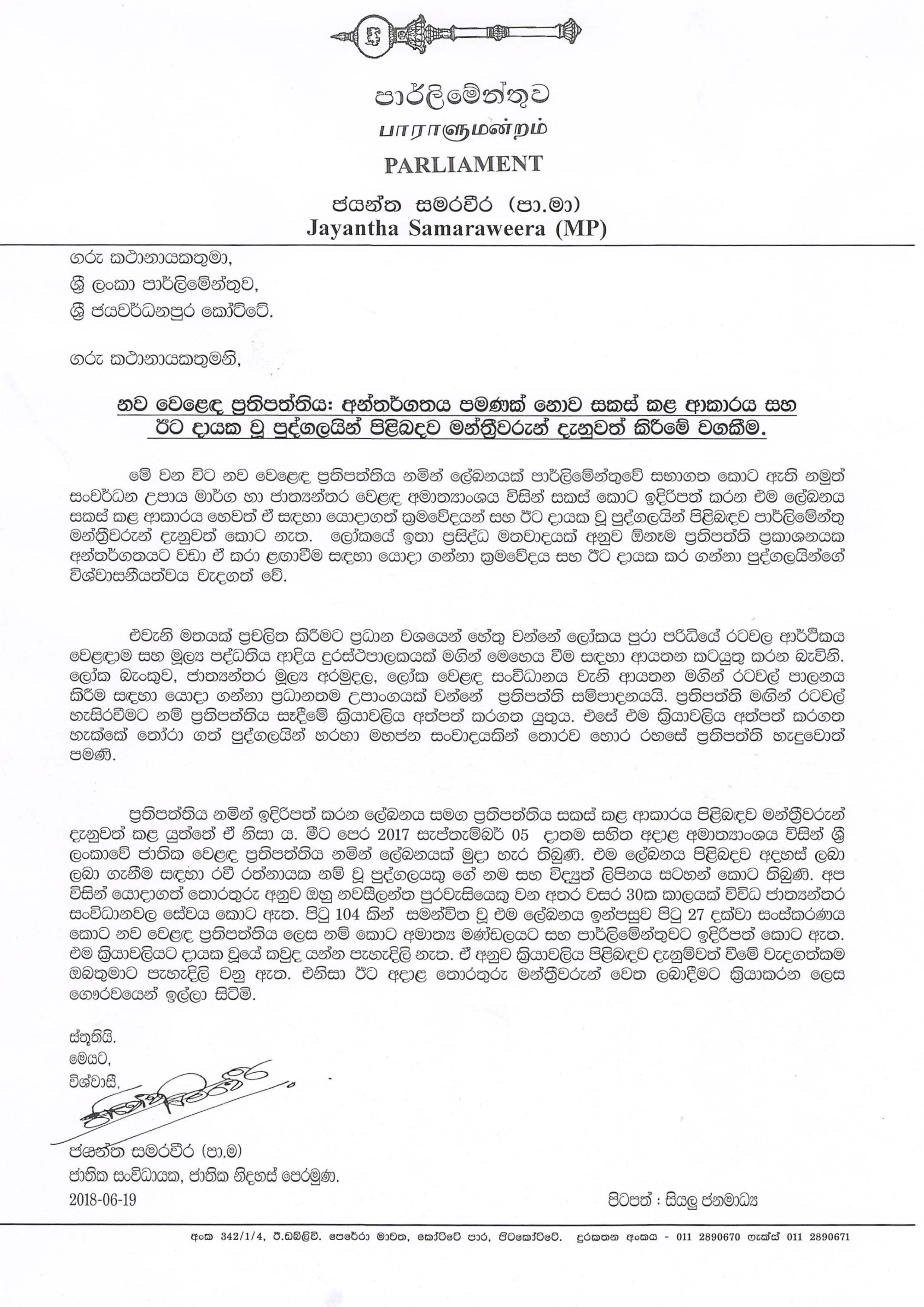 පාර්ලිමේන්තුවේ මේ වනවිට සභාගත කර ඇති නව වෙළෙඳ ප්රතිපත්තිය නමැති ලේඛනය සකස් කළ ආකාරය හෝ ඒ සඳහා යොදා ගත් ක්රම වේදයන් හා ඊට දායක වූ පුද්ගලයින් පිළිබඳව පාර්ලිමේන්තු මන්ත්රීවරුන් දැනුවත් කර නොමැති බැවින් මන්ත්රීවරුන් දැනුවත් කිරීමට පියවර ගන්නැයි ජාතික නිදහස් පෙරමුණේ පාර්ලිමේන්තු මන්ත්රී ජයන්ත සමරවීර මහතා කථානායක කරු ජයසූරිය මහතා වෙත ලිපියක් යවමින් ඉල්ලා සිටී.