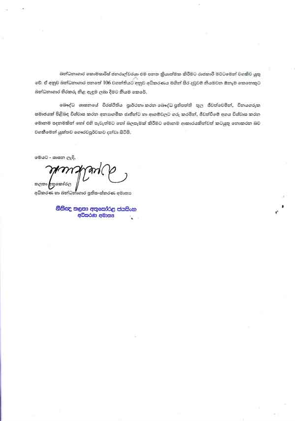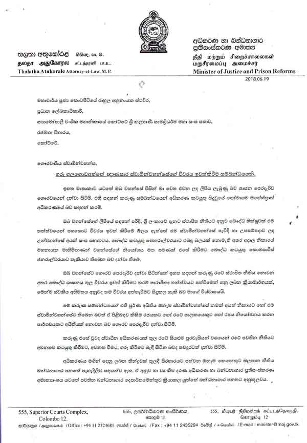 ස්වාධීන අධිකරණයක් තුල රටේ සියලුම පුරවැසියන් වශයෙන් රටේ පවතින නීතියට අවනතව කටයුතු කිරීමට, අවනත වීමට, ගරු කිරීමට බැඳී සිටින බවද දන්වා සිටින බව අධිකරණ අමාත්ය තලතා අතුකෝරල මහත්මිය යැවූ ලිපියේ දැක්වේ.