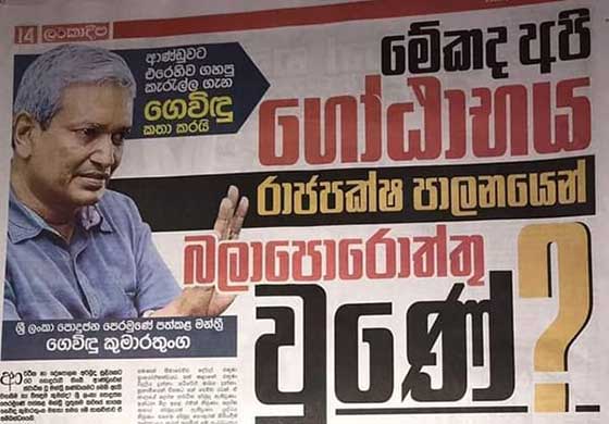 පොදුජන පෙරමුණ සාමූහිකව මොරගොඩ මහතාට ස්තූතිය පළ කරලා තිබුණා. මොරගොඩ මහත්තයාගේ දායකත්වය ගැන. මව්බිම කබලෙන් ළිපට වගෙයි පේන්නේ.