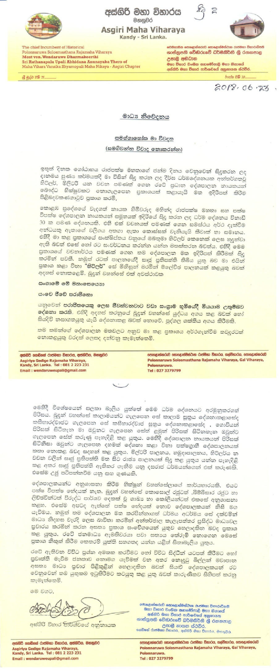 අස්ගිරි පාර්ශවයේ අනුනායක වෙඬරුවේ උපාලි ස්වාමින් වහන්සේ විසින් නිකුත් කළ සම්පූර්ණ මාධ්ය නිවේදනය පහතින් දැක්වෙයි.