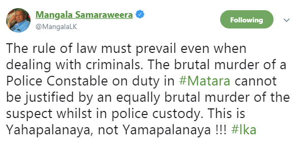 සිය ට්විටර් ගිණුමේ ආන්දෝලනාත්මක සටහනක් තබමින් ඔහු පවසන්නේ “ පොලිස් නිළධාරියාගේ අමානුෂික ඝාතනයට එම ඝාතනය සිදු කළා යැයි සැකකරන පුද්ගලයෙකු පොලිස් අත්අඩංගුවේ සිටියදීම ඝාතනය කිරීමෙන් සාධාරනයක් ඉටු නොවන” බවයි. මේ යහපාලනය මිස යමපාලනය නොවන බවත් අමාත්යවරයා සටහන් කර තිබුණි.