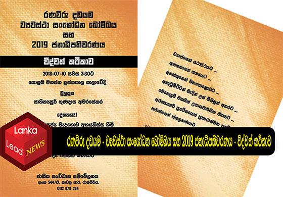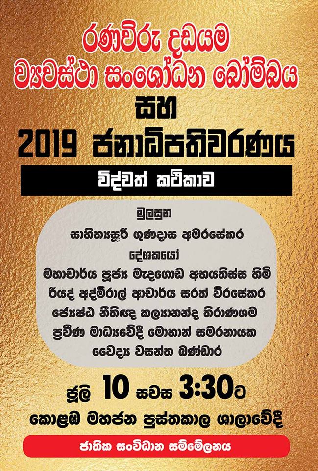 රණවිරු දඩයම, ව්යවස්ථා සංශෝධන බෝම්බය සහ 2019 ජනාධිපතිවරණය යන මැයෙන් ජාතික සංවිධාන සම්මේලනය මගින් පවමත්වනු ලබන විද්වත් කථිකාව 2018 ජූලි 10 වැනි දින සවස 3:30ට කොළඹ මහජන පුස්තකාල ශාලාවේදී පැවැත්වේ.