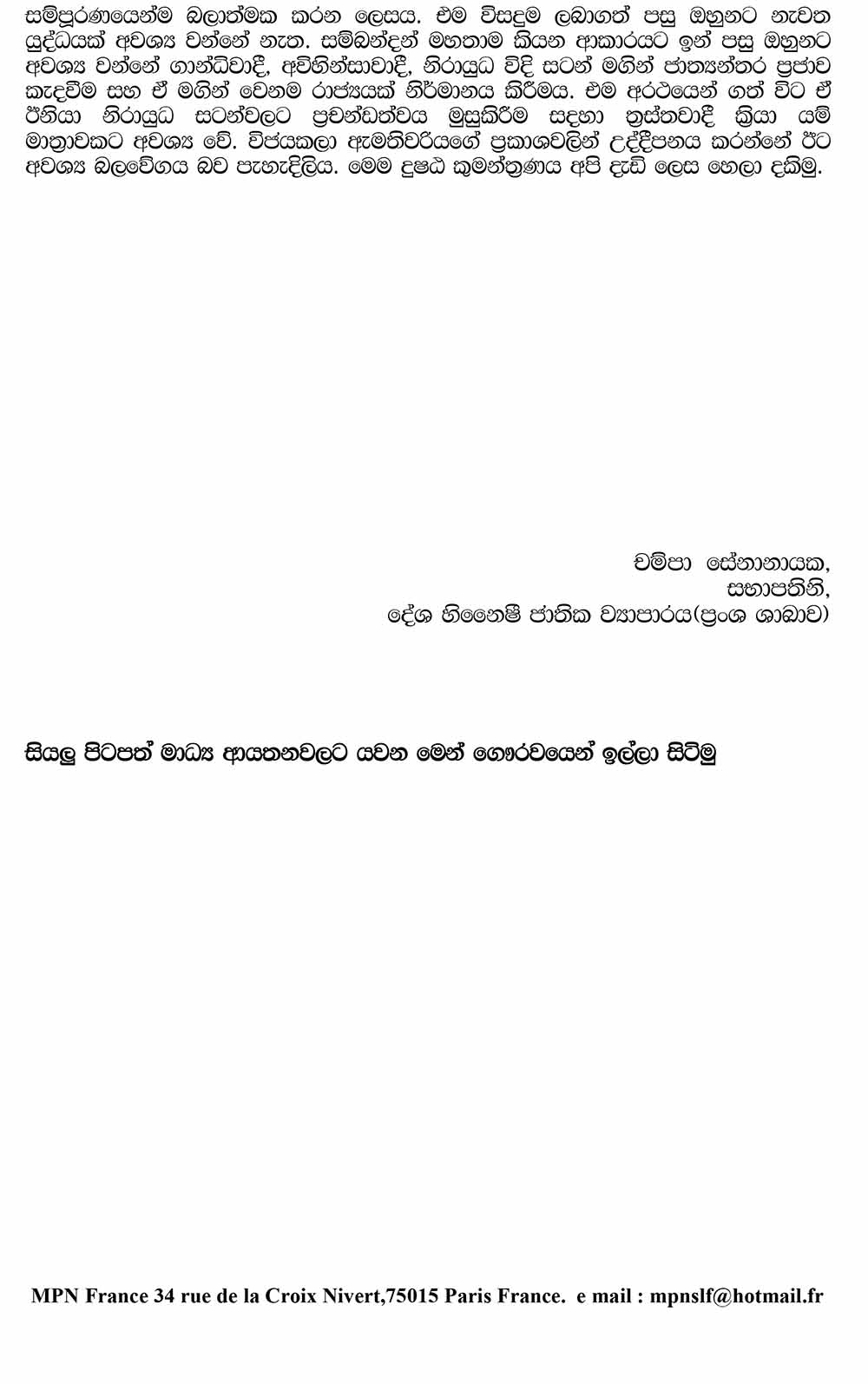 එල්ටීටීඊය නැවත ගොඩනැගිය යුතු බවට එක්සත් ජාතික පක්ෂ පාර්ලිමේන්තු මන්ත්රිනී විජයකලා මහේෂ්වරන් මහත්මිය සිදු කළ ප්රකාශයට විරෝධය පළ කරමින් ප්රංශයේ වෙසෙන ශ්රී ලාංකික ජනතාව එහි ශ්රී ලංකා තානාපති කාර්යාලය ඉදිරිපිටදි පසුගිය සදුදා (09) විරෝධතා ව්යාපාරයක නිරත වූහ.