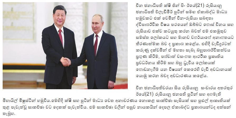 චීන ජනාධිපති ක්ෂී ජින් පිං ඉකුත් 21 වැනි දා රුසියානු ජනාධිපති ව්ලැඩිමීර් පුටින් සමඟ ඒකාබද්ධ මාධ්ය හමුවකට එක් වෙමින් චීන-රුසියා සබඳතා ද්විපාර්ශ්වික විෂය පථයෙන් ඔබ්බට ගොස් චීනය සහ රුසියාව එක්ව කටයුතු කරන බවත් එම එකමුතුව සමස්ත ලෝකයට සහ මානව වර්ගයාගේ අනාගතයට තීරණාත්මක වන බවත් ප්රකාශ කළේය.