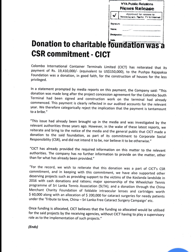 හිටපු අමාත්ය බැසිල් රාජපක්ෂ මහතාගේ බිරිඳ වන පුෂ්පා රාජපක්ෂ මහත්මියට මුදල් ලබා දුන් බව කලම්බු ඉන්ටර්නැෂනල් කන්ටේනර් ටර්මිනල්ස් සමාගම පිළිගෙන ඇතැයි ඔවුන් නිකුත් කළ නිවේදනයක් උපුටා දක්වන මාධ්ය අද අනාවරණය කළේ ය.