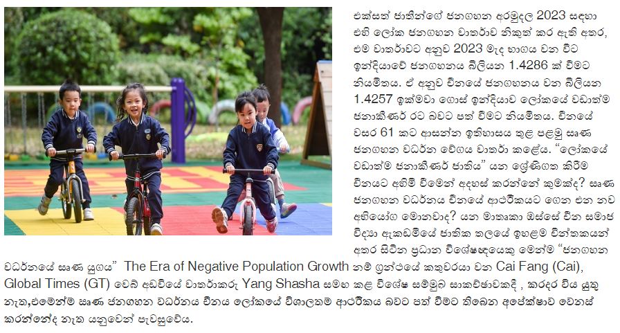 මේ පිළිබඳව අදහස් දක්වන චීන සමාජ විද්යා ඇකඩමියේ ජාතික තලයේ ඉහළම චින්තකයන් අතර සිටින ප්රධාන විශේෂඥයෙකු මෙන්ම “ජනගහන වර්ධනයේ සෘණ යුගය” The Era of Negative Population Growth නම් ග්රන්ථයේ කතුවරයා වන Cai Fang (Cai), Global Times (GT) වෙබ් අඩවියේ වාර්තාකරු Yang Shasha පවසන්නේ සෘණ ජනගහන වර්ධනය, චීනය ලෝකයේ විශාලතම ආර්ථිකය බවට පත් වීමට තිබෙන අපේක්ෂාවට කිසිඳු බාධාවක් නොවන බවයි.