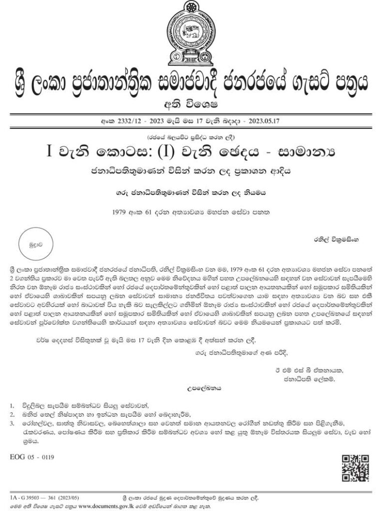 සේවා තුනක් අත්යවශ්ය සේවාවන් බවට පත්කරමින් ජනාධිපතිවරයා විසින් අතිවිශේෂ ගැසට් නිවේදනයක් නිකුත් කර තිබේ.