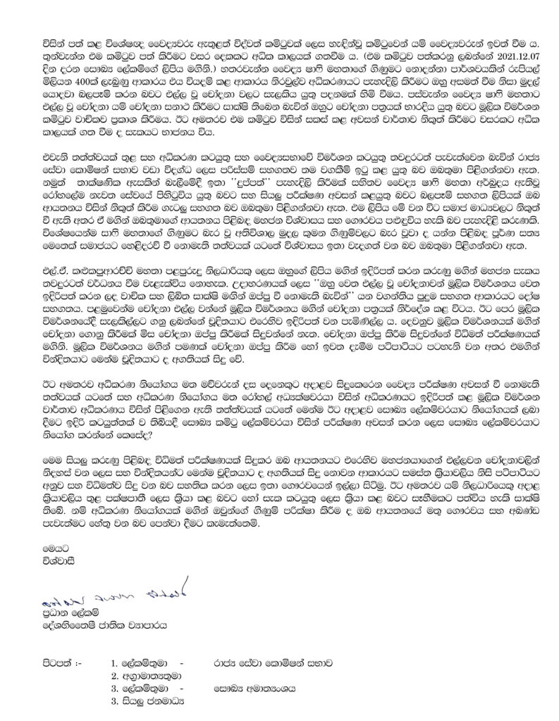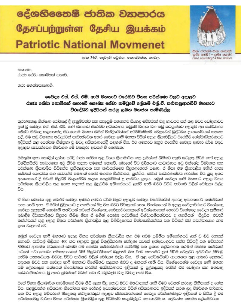 වෛද්ය ෂාෆි මහතා කුරුණෑගල ශික්ෂණ රෝහලේ දී සිංහල මව්වරුන්ට වඳ සැත්කම් සිදුකළ බවට ඔහුට එල්ල වූ චෝදනා සම්බන්ධයෙන් විමර්ශන තවමත් සම්පූර්ණයෙන්ම අවසන් නොවූ පසුබිමක ෂාෆි මහතාව එම රෝහලේම නැවත සේවයේ පිහිටුවිය යුතු බවට හා ඔහුගේ සියලු පරීක්ෂණ අවසන් කළ යුතු බවට රාජ්ය සේවා කොමිෂන් සභාවේ සෞඛ්ය සේවා කමිටුවේ ලේකම් එල්. ඒ. කළුකපුආරච්චි මහතා යොමුකළ ලිපිය සම්බන්ධයෙන් දේශහිතෛෂී ජාතික ව්යාපාරය මෙම පැමිණිල්ල ඉදිරිපත් කර ඇත.