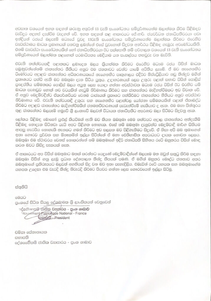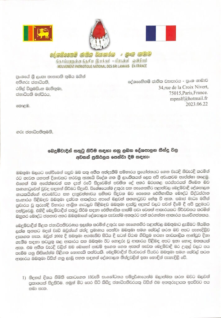 ජනාධිපති රනිල් වික්රමසිංහ මහතා විසින් අතීතයෙන් පාඩම් ඉගෙන නොගෙන බෙදුවාදීන් සතුටු කිරීමේ වෑයමක නිරතවී සිටින බව පෙනෙන්නට ඇති බව පවසමින් දේශහිතෛෂී ජාතික ව්යාපාරයේ ප්රංශ ශාඛාව මගින් අවවාදාත්මක ලිපියක් ජනාධිපතිවරයාට යොමු කොට තිබේ.