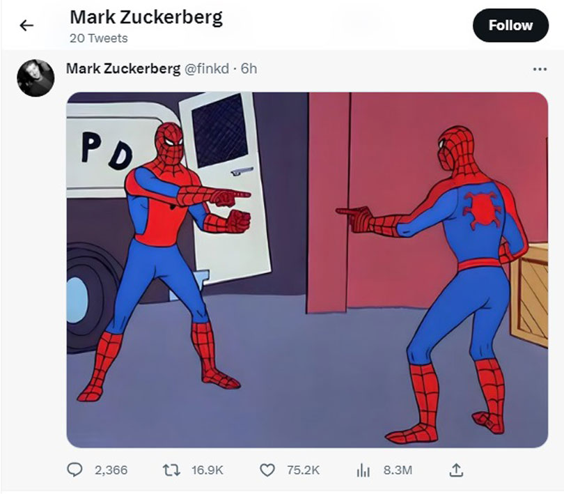 ද්විත්ව අනන්යතාවයක් සහිත ස්පයිඩර් මෑන් රූ සටහනක් මාර්ක් සකර්බර්ග් ට්විටර් හි තබා ඇත. ඉන් අදහස් වන්නේ ට්විටර් සමාජ මාධ්යයට සියයට 100 සමාන තවත් අමුත්තෙක් සමාජ මාධ්ය වෙත පැමිණියා යන්න බව විශ්ලේෂකයෝ පවසති.