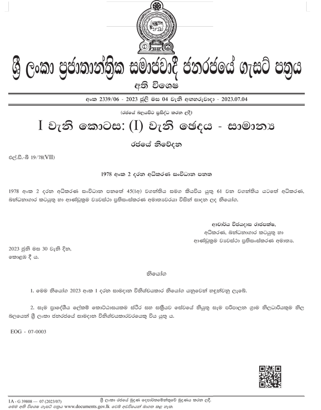 අධිකරණ අමාත්ය විජයදාස රාජපක්ෂ මහතා විසින් මෙම ගැසට් නිවේදනයක් නිකුත් කර තිබේ.