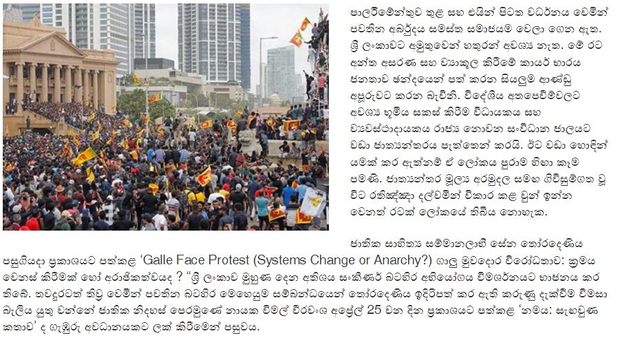 පසුගිය දා සේන තෝරදෙණිය මහතා විසින් නිකුත් කළ ‘Galle Face Protest (Systems Change or Anarchy?) ගාලු මුවදොර විරෝධතාව: ක්රමය වෙනස් කිරීමක් හෝ අරාජිකත්වයද ?‘ යන කෘතිය මගින් මෙම ඊනියා අරගලයේ සැබෑ තුතු සමාජය හමුවේ දීර්ඝ වශයෙන් සාක්ෂි හා සාධක සහිතව අනාවරණය කර තිබේ.