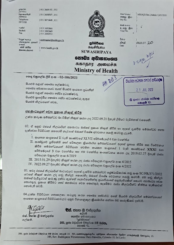 රජයේ නිලධාරීන් ජනමාධ්ය ඔස්සේ ප්රකාශ නිකුත් කිරීම හා අදහස් දැක්වීමට අදාළව සෞඛ්ය අමාත්යාංශයේ ලේකම් එස් ජනක චන්ද්රගුප්ත මහතාගේ අත්සනින් යුතු ලිපියක් නිකුත් කර තිබේ.