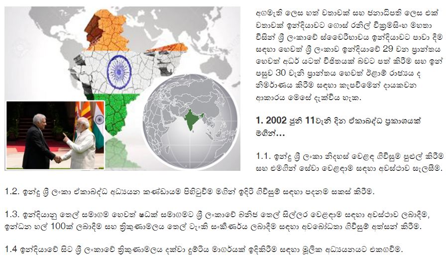 රනිල් වික්රමසිංහ මහතා 8 වැනි වතාවට එකඟවන්නේ ශ්රී ලංකාව සම්පූර්ණයෙන්ම ඉනිදියාවේ අර්ධ යටත්විජිතයක් බවට පත්කෙරෙන විස්තීරණ ආර්ථික ඒකාබද්ධකරණයක් සඳහා බවට ඔහු කරුණු දක්වයි. එමගින් ශ්රී ලංකාව ක්රමානුකූලව ඉන්දියාවේ 29 වැනි ප්රාන්තය බවට පත්වන බව ද ඔහු විසින් පෙන්වා දී ඇත.
