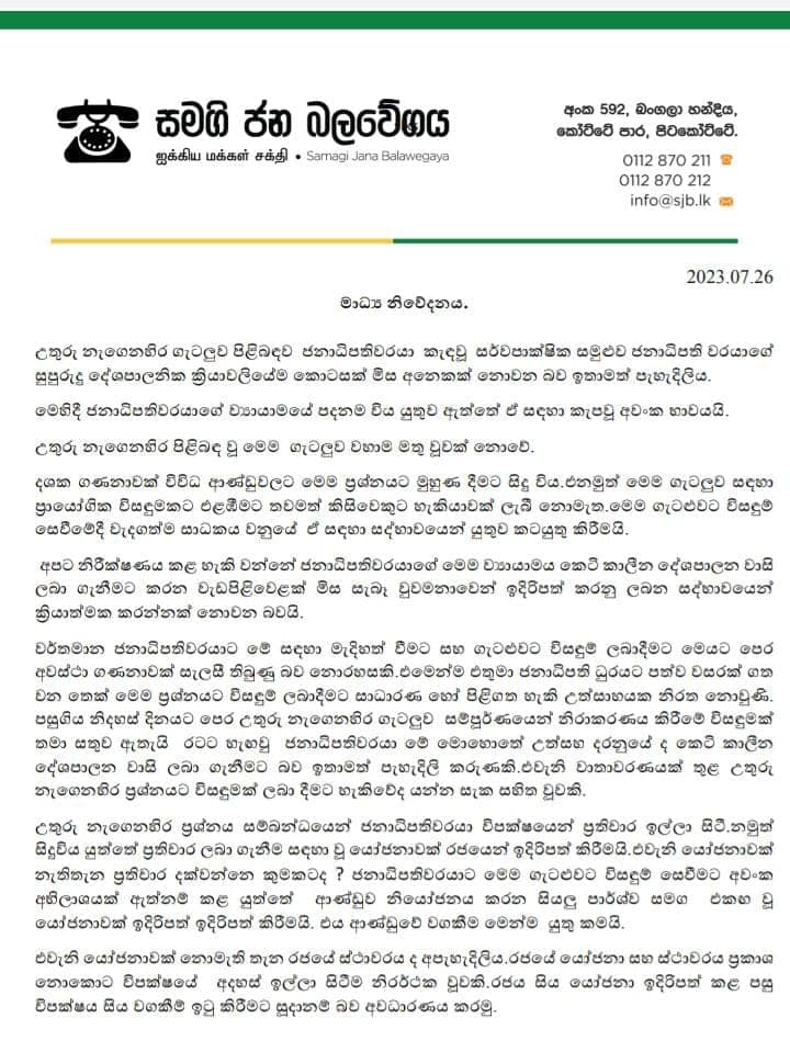 උතුරු නැගෙනහිර ප්රශ්නය සම්බන්ධයෙන් ජනාධිපතිවරයා විපක්ෂයෙන් ප්රතිචාර ඉල්ලා සිටින බවද සිදුවිය යුත්තේ ප්රතිචාර ලබාගැනීම සඳහා වූ යෝජනාවක් රජයෙන් ඉදිරිපත් කිරීම බවද සමගි ජන බලවේගයේ මතය බව එහි දක්වා තිබේ.