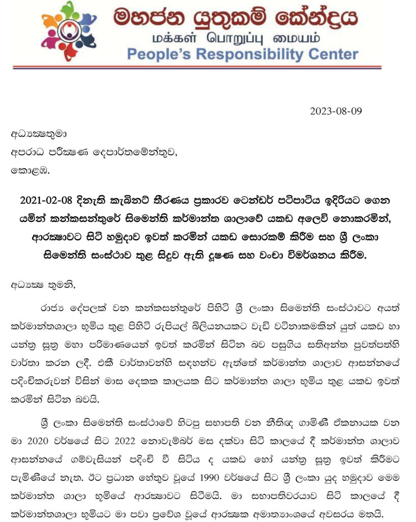 සිමෙන්ති සංස්ථාව තුළ සිදුවන වංචා හා දූෂණ සම්බන්ධවත්, එහි ආරක්ෂාවට සිටි හමුදා නිලධාරින් ඉවත් කිරීම සම්බන්ධවත් එමගින් වර්තමානයේ සිමෙන්ති සංස්ථාව තුළ මහා පරිමාණ යකඩ සොරකම් කිරීම් සිදුවන බවත් පෙන්වා දෙමින් එම සංස්ථාවේ හිටපු සභාපති නීතිඥ ගාමිණී ඒකනායක මහතා අපරාධ පරීක්ෂණ දෙපාර්තමේන්තුවට පැමිණිල්ලක් සිදුකර තිබේ.