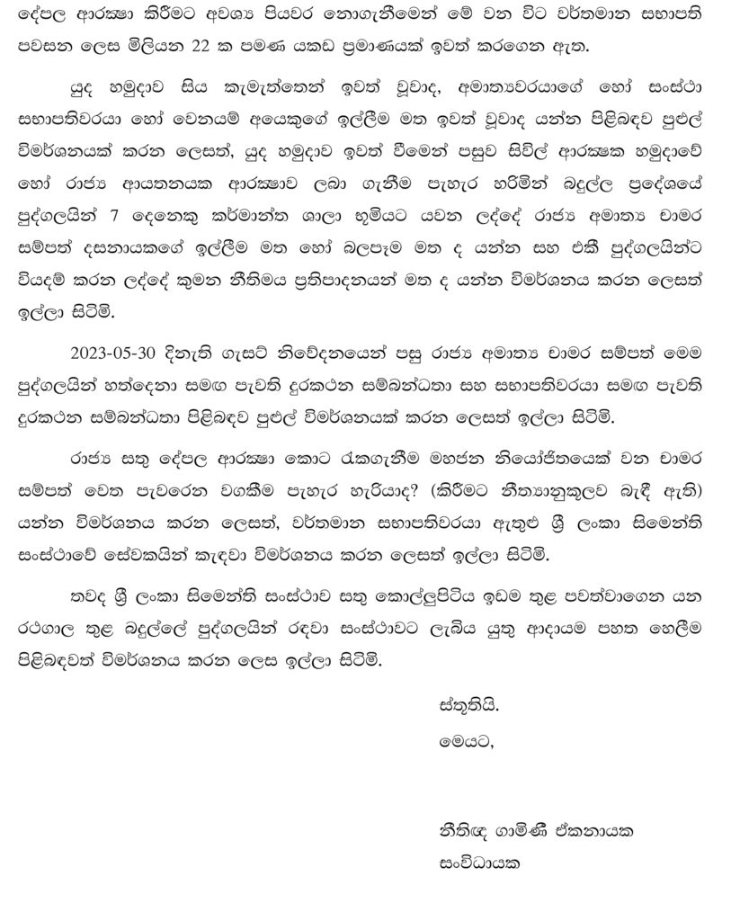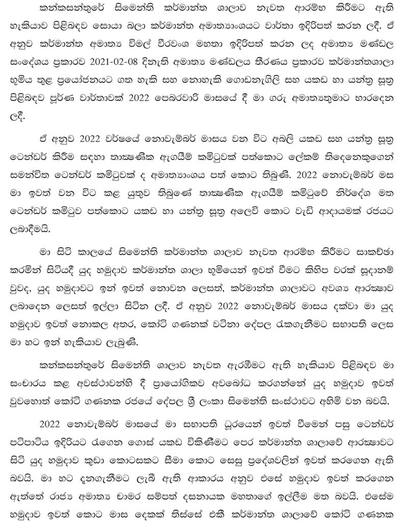සංස්ථා භූමියෙන් හමුදාව ඉවත් කිරීම සිදුකර ඇත්තේ රාජ්ය අමාත්ය චාමර සම්පත් දසනායක බවත්, හමුදාව සිටිය දී කර්මාන්ත ශාලාවට අයත් කෝටි ගණනක දේපළ ආරක්ෂා වූ බවත් ඒ මහතා එම පැමිණිල්ලේ දක්වා තිබේ.