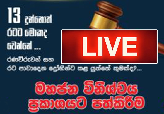 ‘13 දුන්නොත් රටට මොකද වෙන්නේ?‘ මහජන විනිශ්චය ප්රකාශයට පත්කිරීමේ අවස්ථාව තුන්මුල්ල සම්බුද්ධත්ව ජයන්ති මන්දිරයේ දී අද සවස 3.30 ට සිදුකෙරේ.
