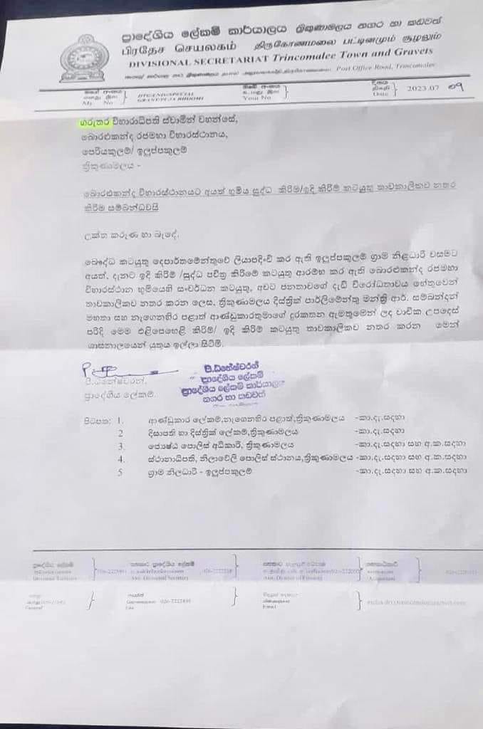බෞද්ධ කටයුතු දෙපාර්තමේන්තුවේ ලියාපදිංචි විහාරස්ථානයක් වන ත්රිකුණාමලය බොරළුකන්ද විහාරස්ථානයේ සංවර්ධන කටයුතු සාසනාලයෙන් යුතුව නවතා දමන ලෙස ප්රාදේශීය ලේකම්වරයා විහාරාධිපති ස්වාමීන් වහන්සේට නියෝගකර ඇත.