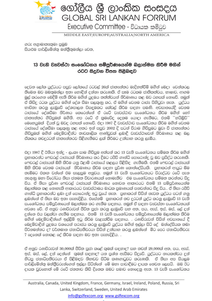 දෙවන ලෝක යුද්ධයෙන් පසුව ජාත්යන්තර මැදිහත් වීම මත මේ වන විට රටවල් 26ක් බෙදා වෙන්කොට ඇති බවත්, 1987 දී ඉන්දු – ලංකා ගිවිසුම හරහා 13 වැනි සංශෝධනය සම්මත කළේ ද රජිව් ගාන්ධි විසින් වේලුපිල්ලේ ප්රභාකරන්ට ෆෙඩරල් රාජ්යක් නිර්මාණය කර දීම සඳහා බවත් පෙන්වා දෙමින් ගෝලීය ශ්රී ලාංකික සංසදය අග්රාමාත්යවරයා ප්රමුඛ පාර්ලිමේන්තු මන්ත්රීවරුන්ට ලිපියක් යොමු කොට තිබේ.
