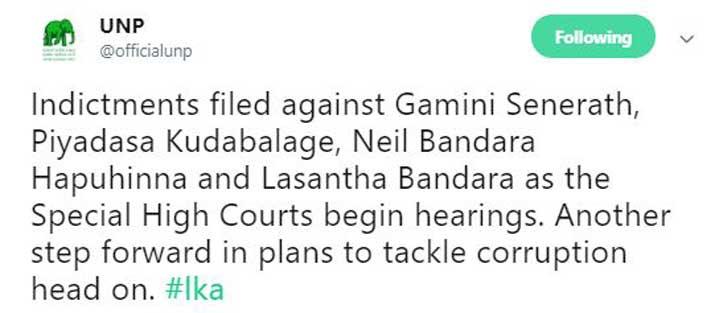 එහි මුලින්ම රාජ්ය මුදල් අවභාවිත කිරීම සම්බන්ධයෙන් හිටපු ජනපති මහින්ද රාජපක්ෂ මහතාගේ කාර්ය මණ්ඩල ප්රධානී ගාමිණී සෙනරත් ඇතුළු තිදෙනෙකුට එරෙහි නඩුව විභාග කර ඇති අතර ඔවුන්ට අධිචෝදනා භාරදුන් බව එක්සත් ජාතික පක්ෂයේ නිල ට්විටර් ගිණුම ප්රකාශ කරයි.