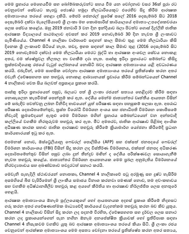 කෙසේ නමුත් චැනල් 4 නාලිකාව මඟින් ඉදිරිපත් කරන ලද පදනම් විරහිත, ද්වේශ සහගත සහ දුර්වල ලෙස සනාථ කරන ලද ප්රකාශයන්ගෙන් පැන නඟින ඕනෑම අනපේක්ෂිත ක්රියාවක් හෝ ප්රතිවිපාකයක් සඳහා චැනල් 4 නිසැකවම වගකිව යුතු බව ද ආරක්ෂක අමාත්යාංශය තරයේ පවසයි.