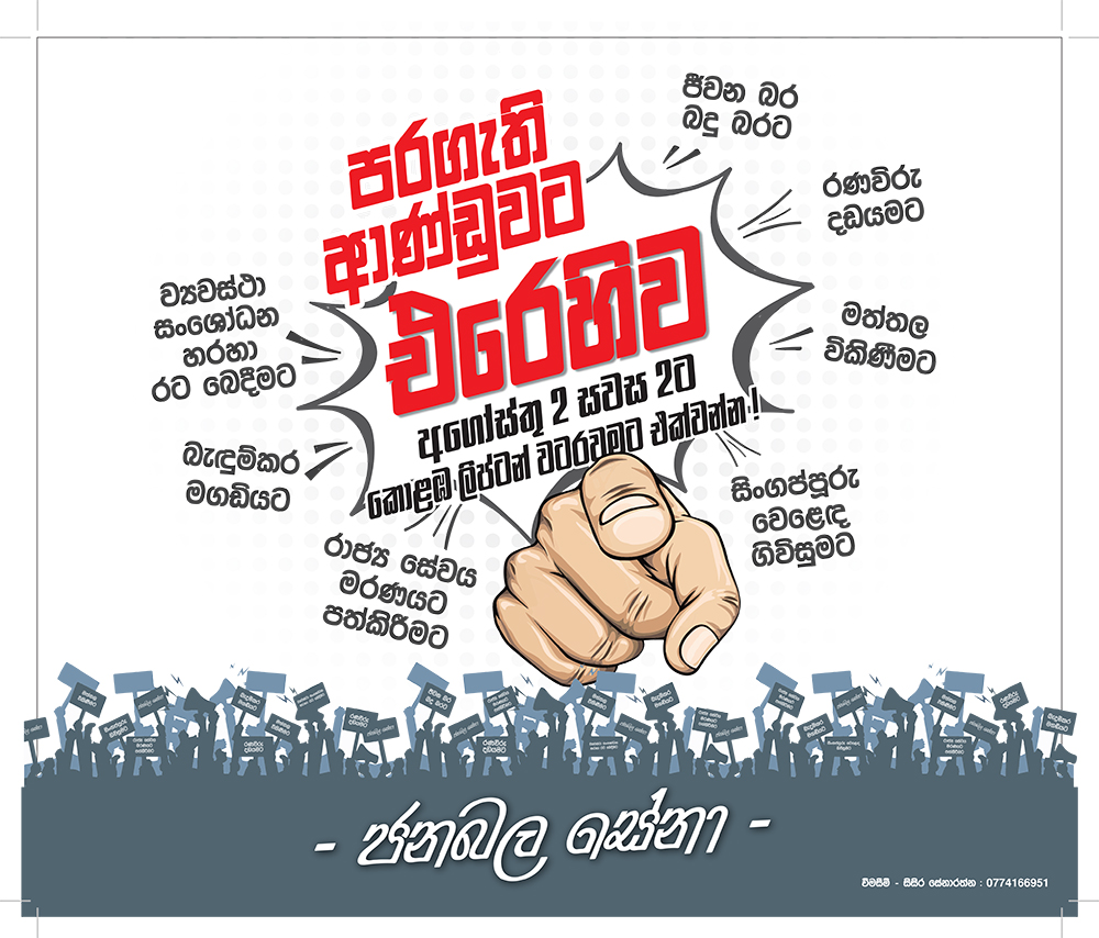 ‘ජනබල සේනා‘ නම් වූ සංවිධානය යටතේ අගෝස්තු 02 වැනිදා සවස කොළඹ දී ‘රට වනසන රට පාවා දෙන පරගැති ආණ්ඩුව ගෙදර යවමු‘ යන තේමාව යටතේ විරෝධතාවක් පැවැත්වීමට ඒකාබද්ධ විපක්ෂය සූදානම් වෙයි.