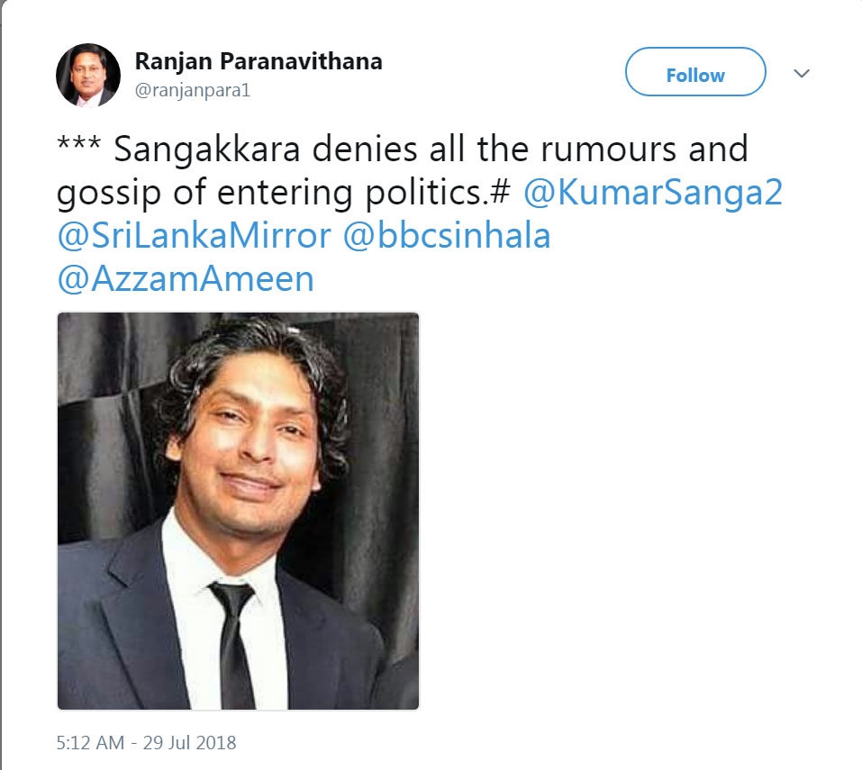 ඉදිරියේ තමා දේශපාලනයට අවතීර්ණ වන බවට පැවසෙන සියලු වාර්තා හා කට කතා අසත්ය බව හිටපු ක්රිකට් නායක කුමාර් සංගක්කාර පවසයි.