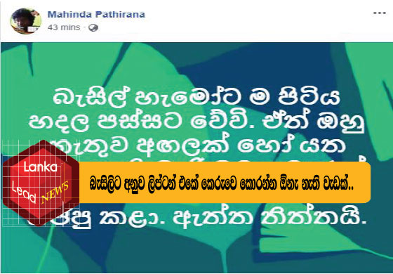 ඔබට සතුටුයිද අහන්න එපා.. මට පට්ට සතුටුයි.. මුංට ඕනෙ රට ගැන හිතන්න නෙවි.. බැසිල් මහෝත්තමයා ඇමරිකාවෙ විවේක ගත්ත කාලෙ මේක පිළිවෙලක් කරපු ඉතුරු එවුන් ටිකටත් මේක එපා කරවලා බැසිලිකාවෙ ‘මමයි රජා’ ෂෝ එක 2015වේ කෙලවගත්ත තැන සිට නැවත අරබන්න..