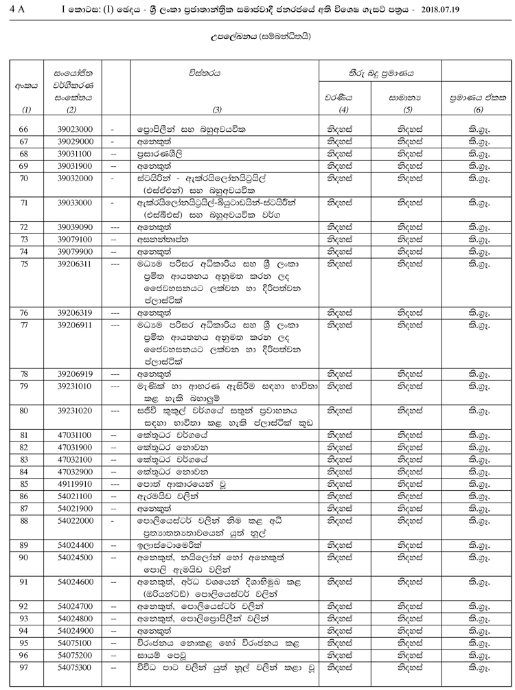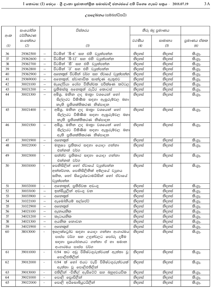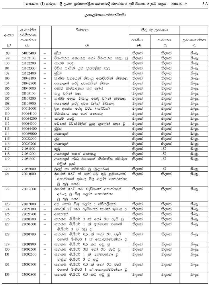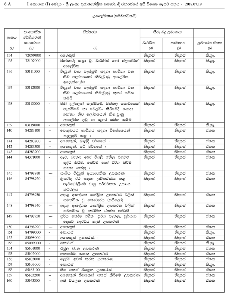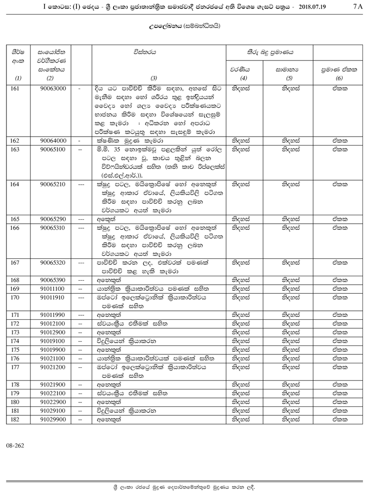 1962 අංක 19 චරක ආදායම් සංරක්ෂණ පනත යටතේ නිකුත් කර ඇති මෙම ගැසට් නිවේදනය මුදල් හා ජනමාධ්ය අමාත්යාංශ ලේකම් ආචාර්ය ආර්.එච්.එස් සමරතුංග මහතා ගේ අත්සනින් නිකුත් කරන ලද්දකි. පහත දැක්වෙන්නේ එම ගැසට් නිවේදනයෙහි සඳහන් තීරු බදු නිදහස් කෙරෙන භාණ්ඩ 182 සඳහන් ලේඛනයයි.