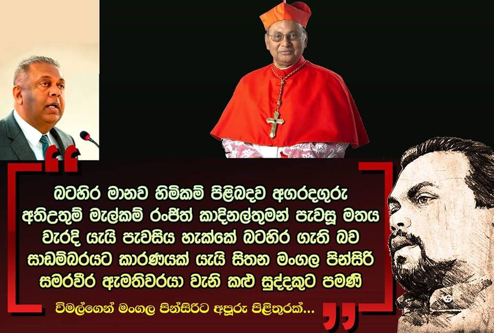 අතිඋතුම් මැල්කම් රංජිත් කාදිනල්තුමන් පැවසූයේ, ඒ අන්දමට බෞද්ධ ධර්මයෙන් පෝෂණය වූ සභ්යත්වයකට හිමිකම් කියන අපට, බටහිර මානව හිමිකම් සංකල්ප පැටවීමේ අවශ්යතාවක් නැති බව ය. එම මතය වැරදි යැයි පැවසිය හැක්කේ බටහිර දැනුම හා බලය හිස්මුදුනින් පිළිගෙන, ඊට ගැතිව ක්රියා කිරීම සාඩම්බරයට හේතුවක් ලෙස දකින මංගල පින්සිරි සමරවීරලා වැනි කළු සුද්දන්ට පමණි. එබැවින් අතිඋතුම් මැල්කම් රංජිත් කාදිනල්තුමන්ගේ නිවැරදි ප්රකාශය වටහා ගැනීමේ ඥානයක් නොමැති වීම හේතුකොටගෙන මංගල පින්සිරි සමරවීර අමාත්යවරයා ඒ කෙරෙහි දක්වන ලද පිළිකුල් කටයුතු ප්රතිචාරය කෙරෙහි අපි අපේ අනුකම්පාව පළකර සිටින්නෙමු.