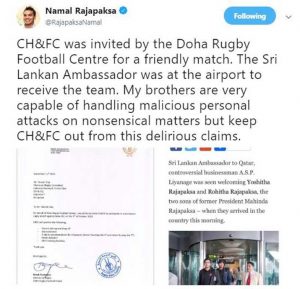 රාජපක්ෂ සොයොයුරන් පිළිගැනීමට කටයුතු කිරීම පිළිබඳව කටාරයේ ශ්රී ලංකා තානාපතිවරයාට විවේචනයක් එල්ල වී ඇති අතර ඒ සම්බන්ධයෙන් පැහැදිලි කිරීමක් පාර්ලිමේන්තු මන්ත්රී නාමල් රාජපක්ෂ මහතා සිය ට්විටර් ගිණුම හරහා සිදුකර තිබේ.