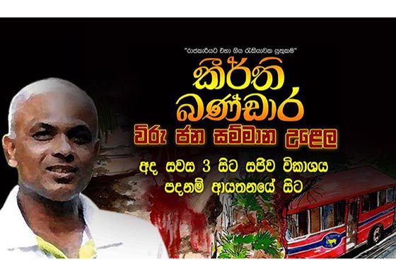 මගීන් පිරිසකගේ ජීවිත බේරා ගැනීම සදහා සිය දිවිය කැප කළ රියදුරු කීර්ති බණ්ඩාර සමරමින් සංවිධාන කෙරෙන ‘‘කීර්ති බණ්ඩාර විරුජන සම්මාන’’ පිරිනැමීමේ වැඩසටහන අද පස්වරුවේ කොළඹ 07 ශී්ර ලංකා පදනම් ආයතනයේදී පැවැත්නාවෙන බව නායකත්ව පුහුණු උපදේශක උදයා දේවාමුල්ල මහතා පවසයි.